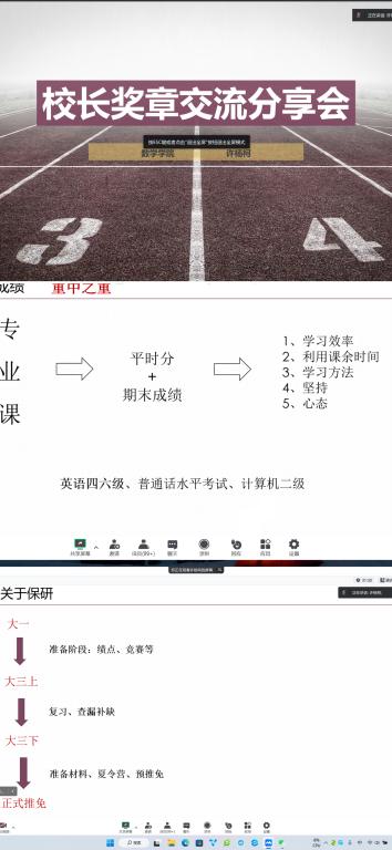 随后又分享了准备保研的流程。大一到大三上学期是准备阶段,大三上到大三下是复习查漏补缺的时间,大三下准备材料、参加夏令营,预推免,然后正式推免。最后对保研相关问题做出了耐心解答。