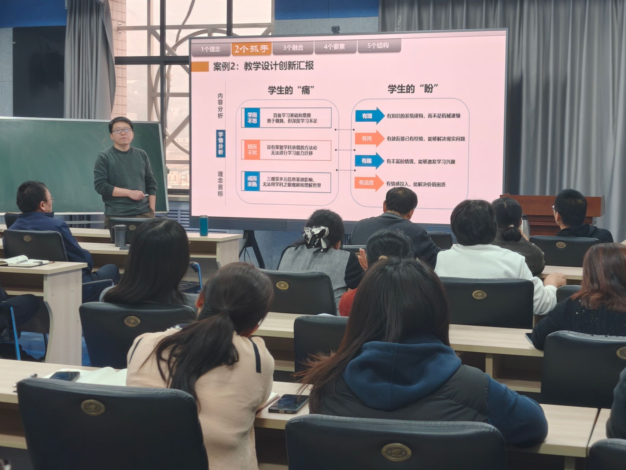 报告会上,惠周利老师结合自身参加国家级教学创新大赛的丰富经验,以 “1 个理念、2 个抓手、3 个融合、4 个要素、5 个结构” 为核心关键词体系,搭配丰富案例、实用技巧与深刻理论分析,为参会教师系统拆解备赛核心要点。内容干货满满,现场教师收获颇丰,会后均表示意犹未尽。