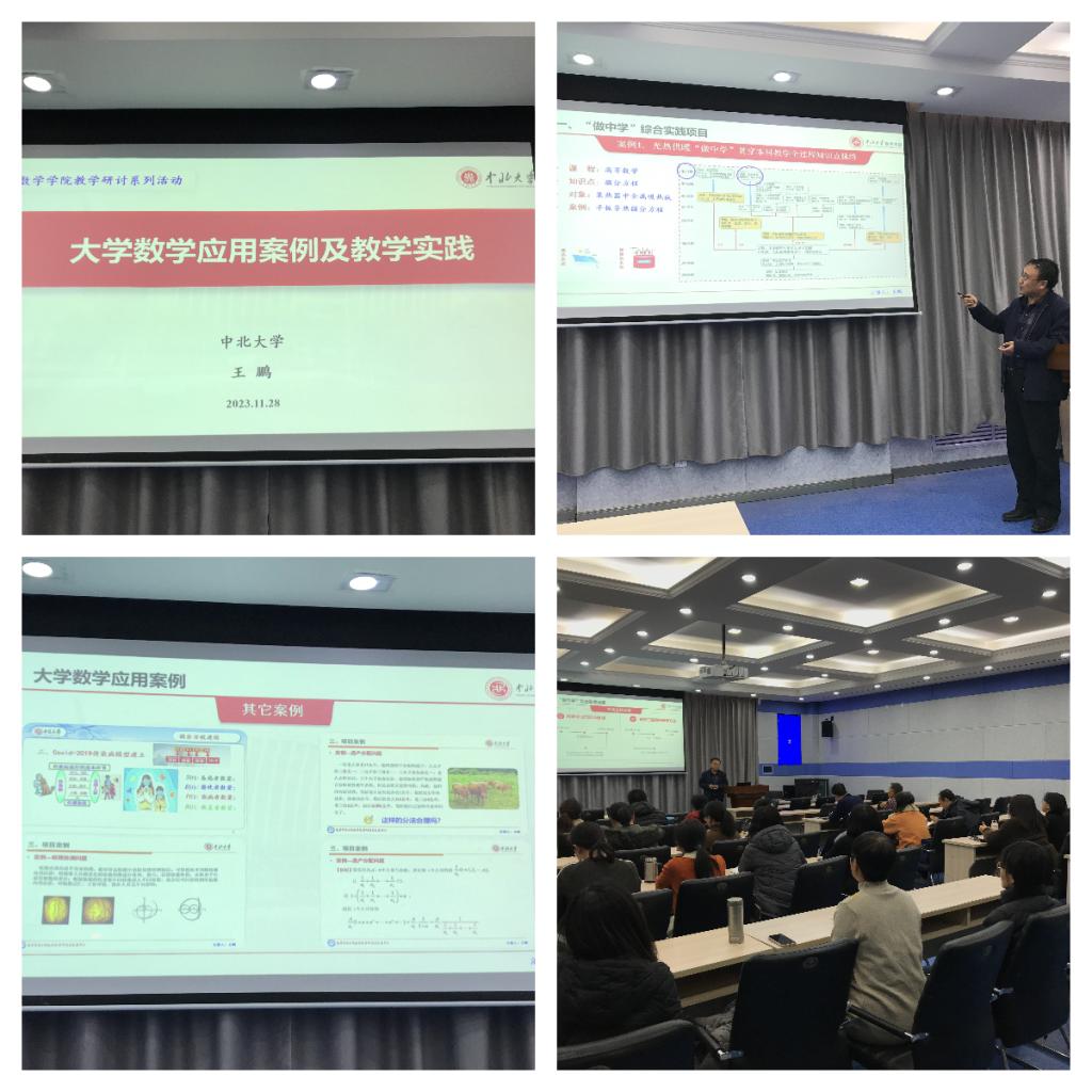 为贯彻落实党的二十大精神,落实我校关于“做中学”项目实践能力培养,1128日下午,大学数学教学中心在9号楼924开展了有关高等数学课程的教学研讨。本次活动由中心主任宋妮老师主持,邀请凤凰彩票平台副院长王鹏教授作了有关《大学数学应用案例及教学实践》讲座。