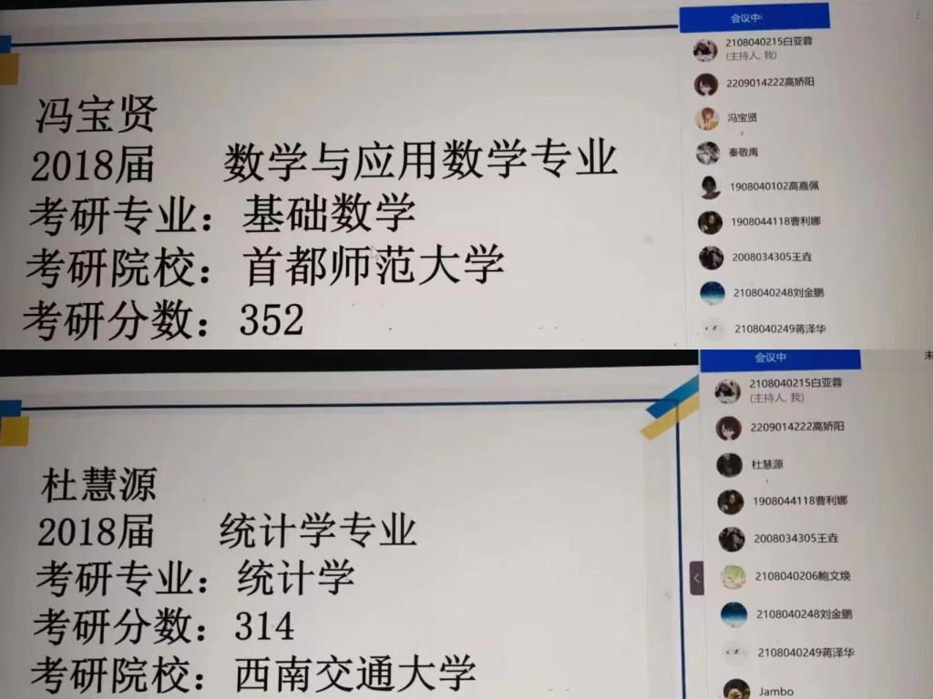 为帮助凤凰彩票平台 学生明确考研复试的方向,掌握面试及复试技巧,进一步提高凤凰彩票平台 考研学子复试通过率,3月17日,凤凰彩票平台 召开考研面试经验分享会,邀请了凤凰彩票平台 2018级顺利上岸的杜慧源,冯宝贤两位同学分享经验,凤凰彩票平台 2019级、2020级学生参加了会议。