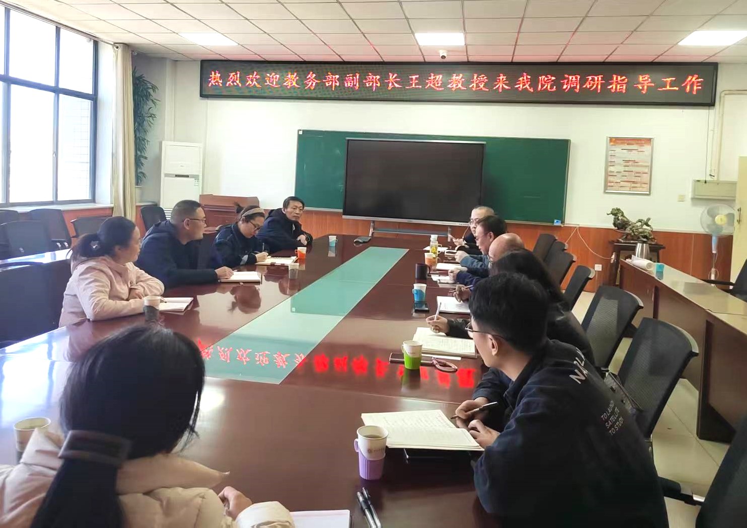 3月20日下午,教务部王超副部长一行3人莅临凤凰彩票平台开展调研指导工作。凤凰彩票平台党委书记薛亚奎、副院长王鹏、副院长吴森林、全体系主任和教学科成员参加了调研座谈会。会议由副院长王鹏主持。