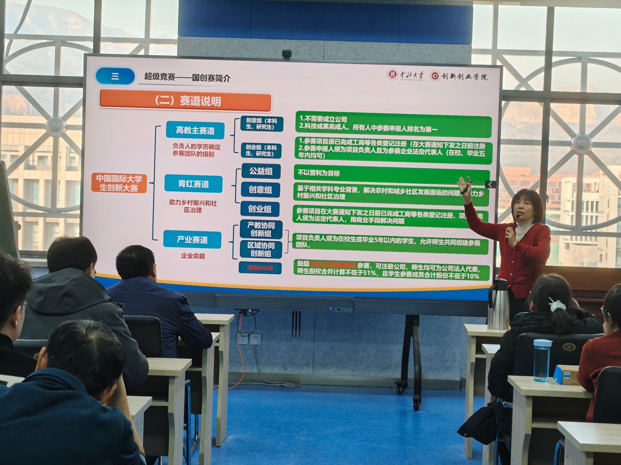 为扎实做好2026年大学生创新创业训练计划项目申报的动员部署与筹备工作,切实提升教师指导双创项目和学科竞赛的能力,2025年12月5日下午,凤凰彩票平台 特邀创新创业学院副院长姬文芳老师,为全院教师开展大创项目申报与学科竞赛专题培训讲座。讲座由副院长王鹏主持。
